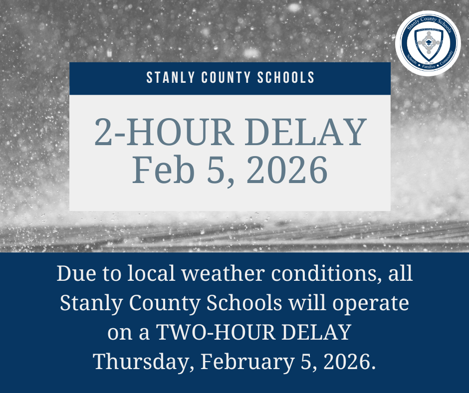 Due to local weather conditions, all Stanly County Schools will operate on a TWO-HOUR DELAY tomorrow, Thursday, February 5, 2026.